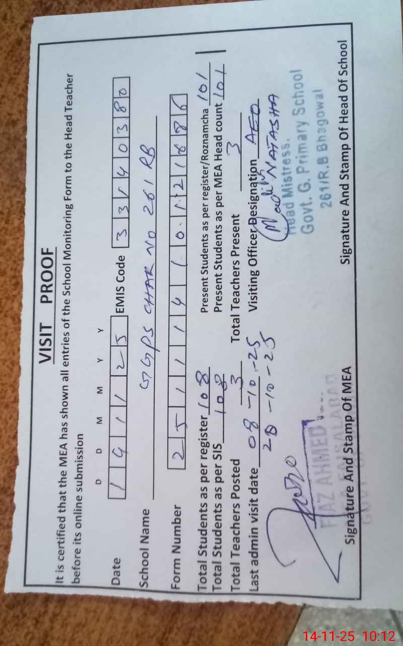 | EMIS Code: 33140380 | Name of School: GGPS CHAK NO. 261 RB | |||