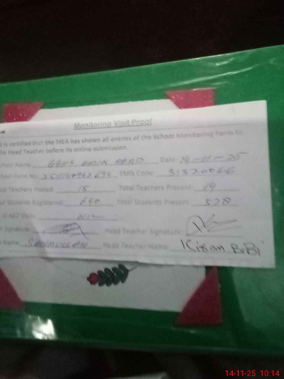 | Attendance Register | Head Teacher | MEA with School | Visit Proof |