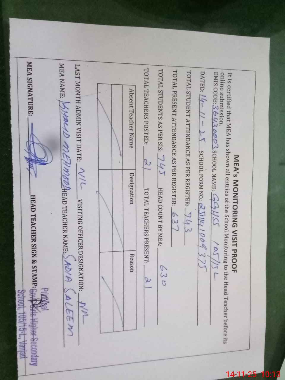 | EMIS Code: 36430003 | Name of School: GGHSS 105/15-L VANJARI, MIAN CHANNU | |||