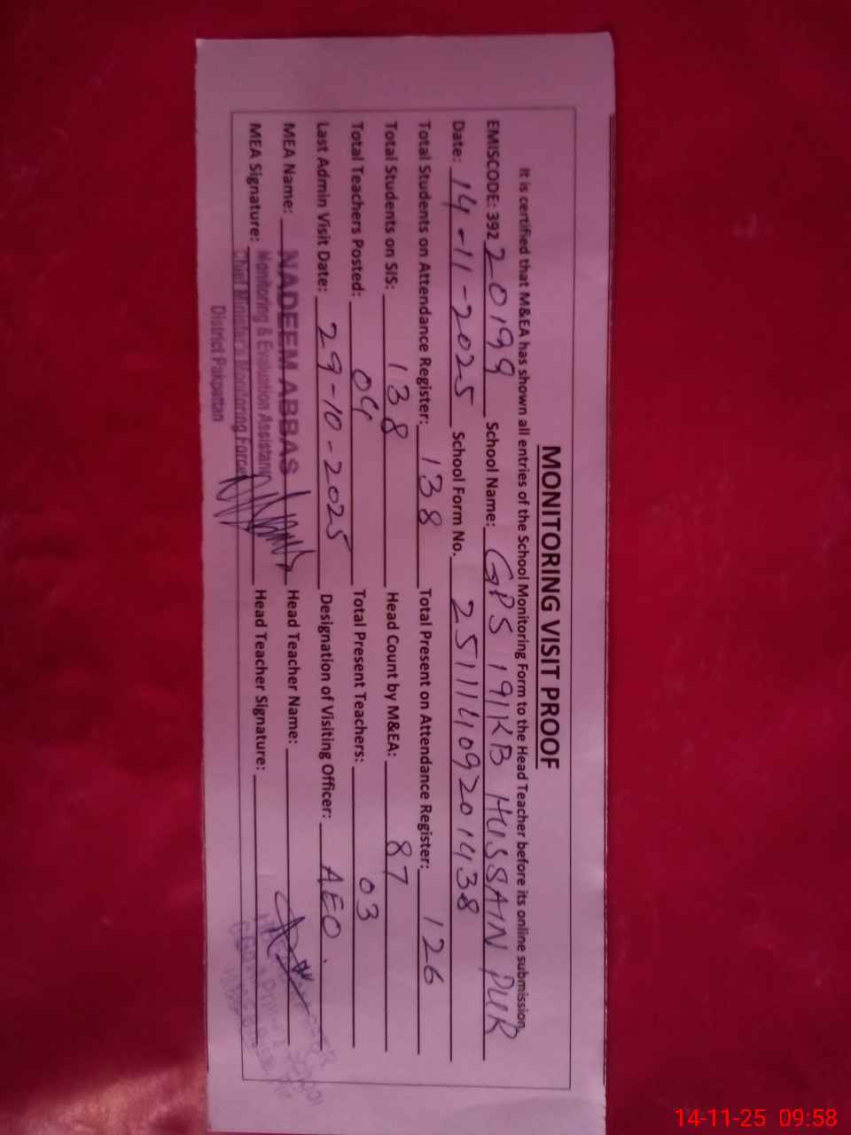 | Attendance Register | Head Teacher | MEA with School | Visit Proof |