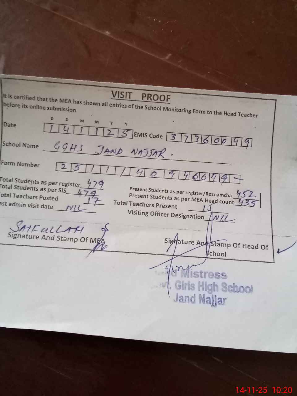 | EMIS Code: 37360049 | Name of School: GGHS JAND NAJAR | |||