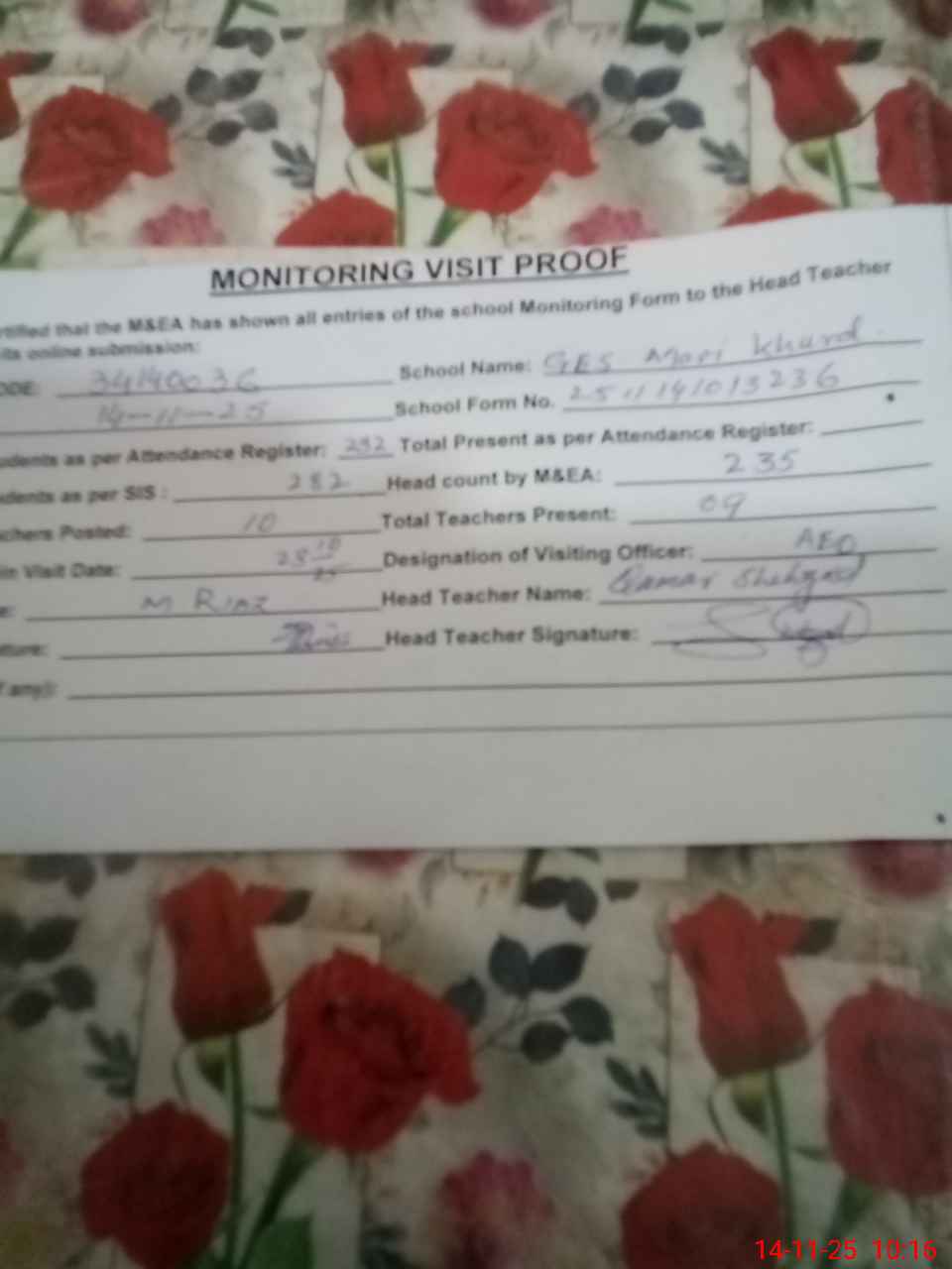 | Attendance Register | Head Teacher | MEA with School | Visit Proof |
