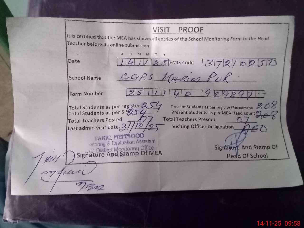 | Attendance Register | Head Teacher | MEA with School | Visit Proof |