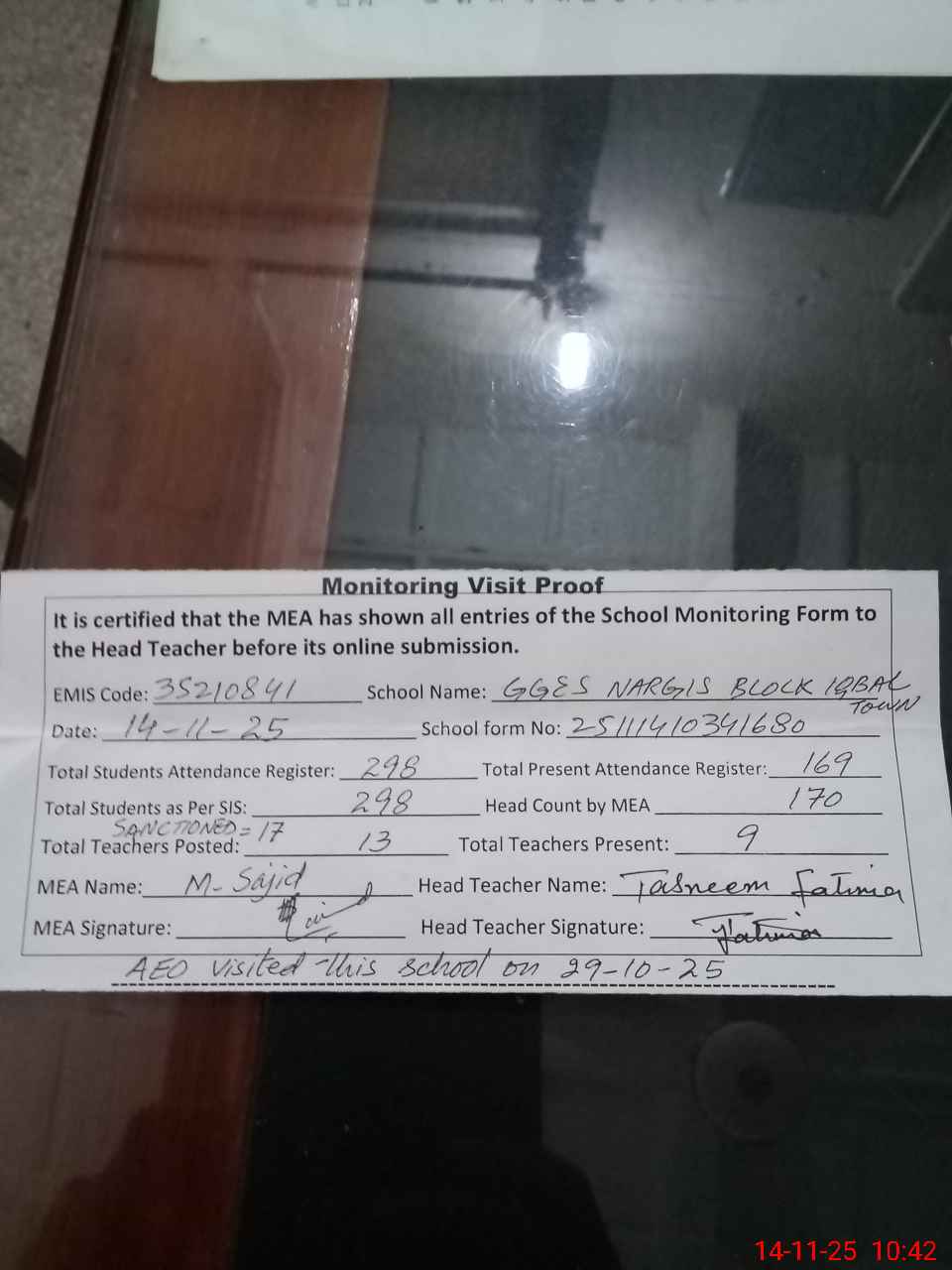 | Attendance Register | Head Teacher | MEA with School | Visit Proof |