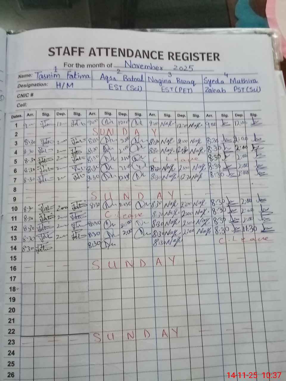 | CNIC | Full Name | Designation | R/C | Absence During Last Calender Month |
