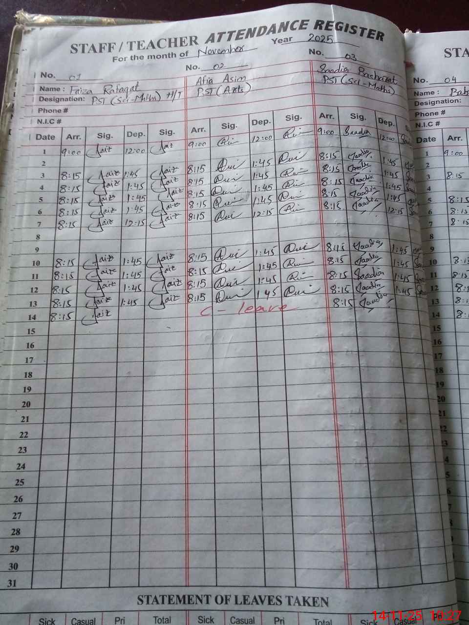 | CNIC | Full Name | Designation | R/C | Absence During Last Calender Month |