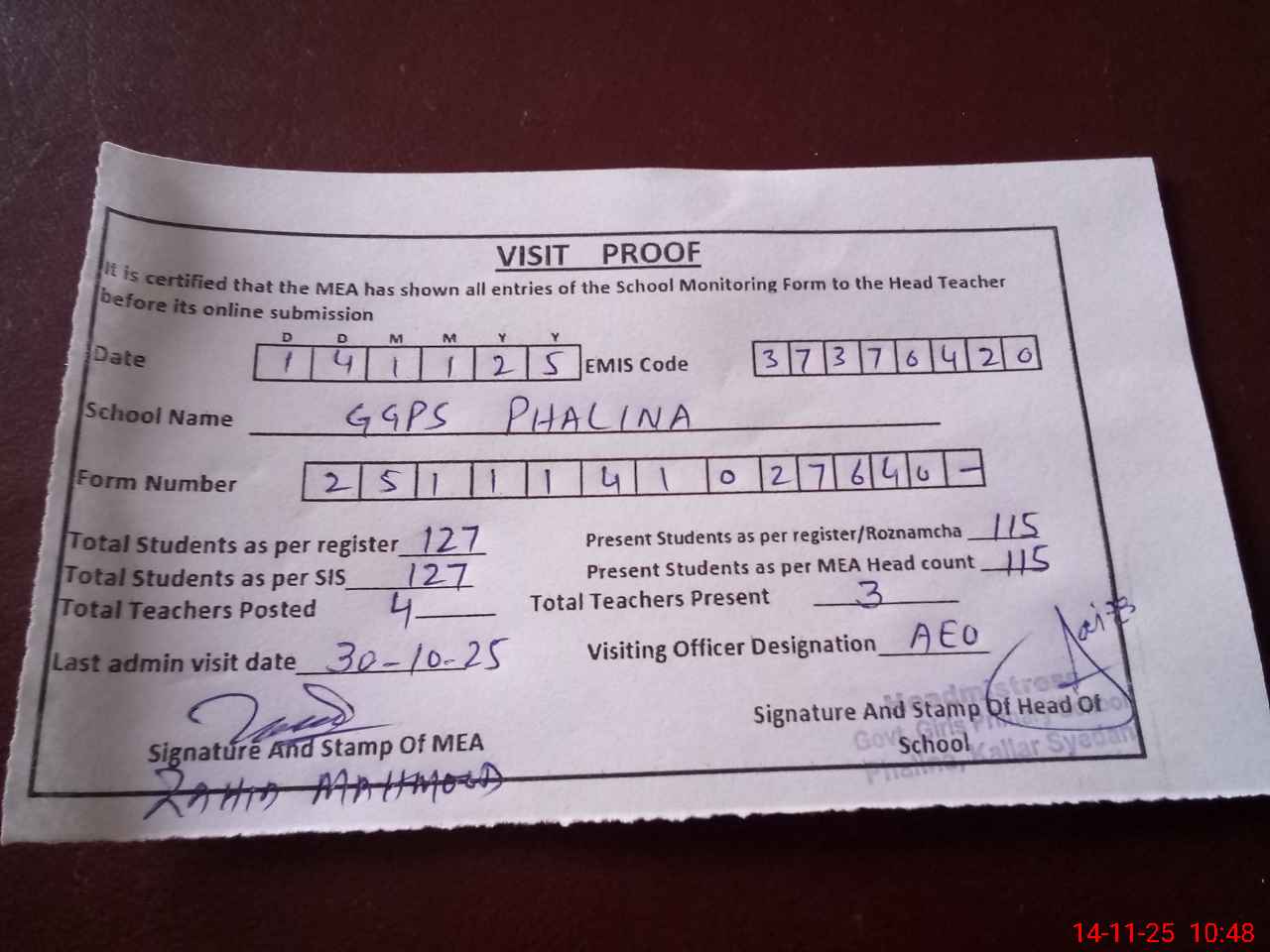 | Attendance Register | Head Teacher | MEA with School | Visit Proof |