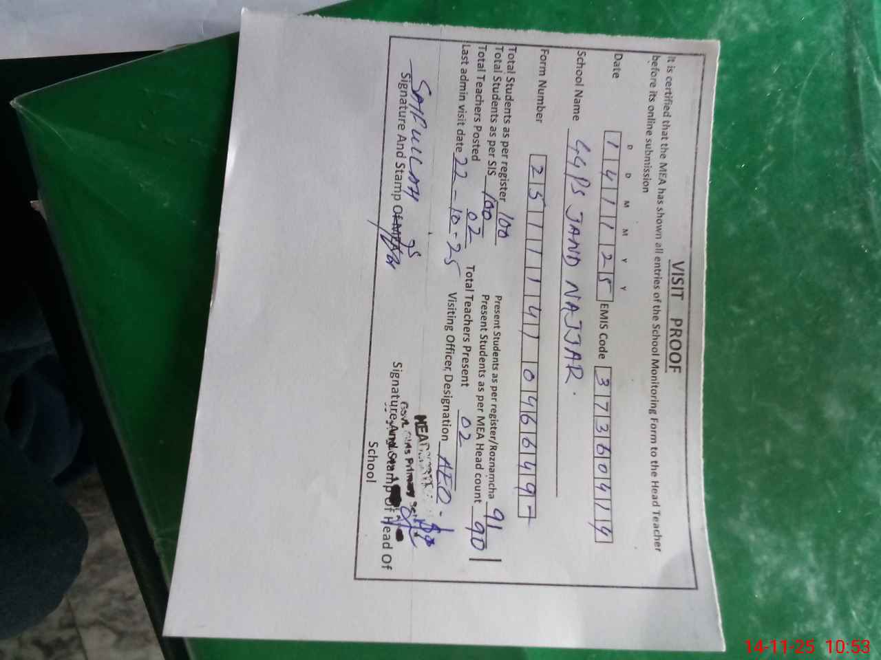 | Attendance Register | Head Teacher | MEA with School | Visit Proof |