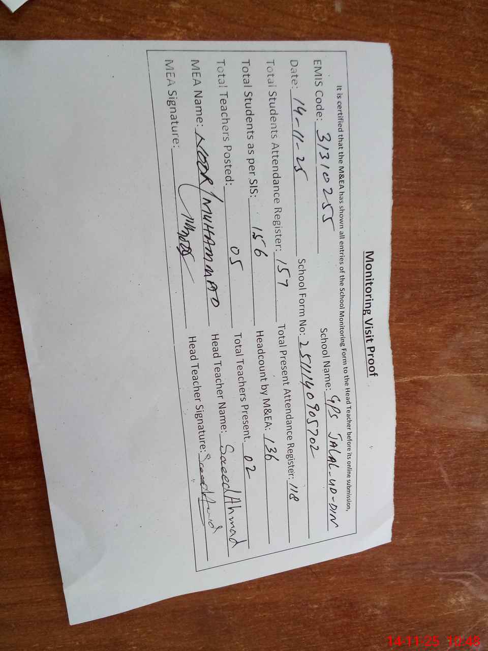 | Attendance Register | Head Teacher | MEA with School | Visit Proof |