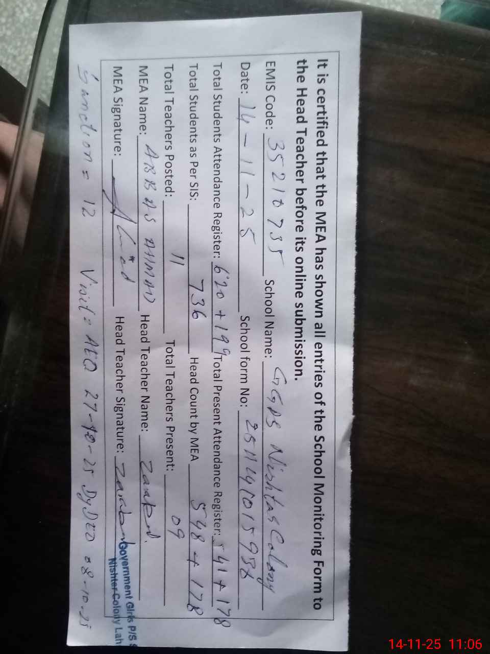 | Attendance Register | Head Teacher | MEA with School | Visit Proof |