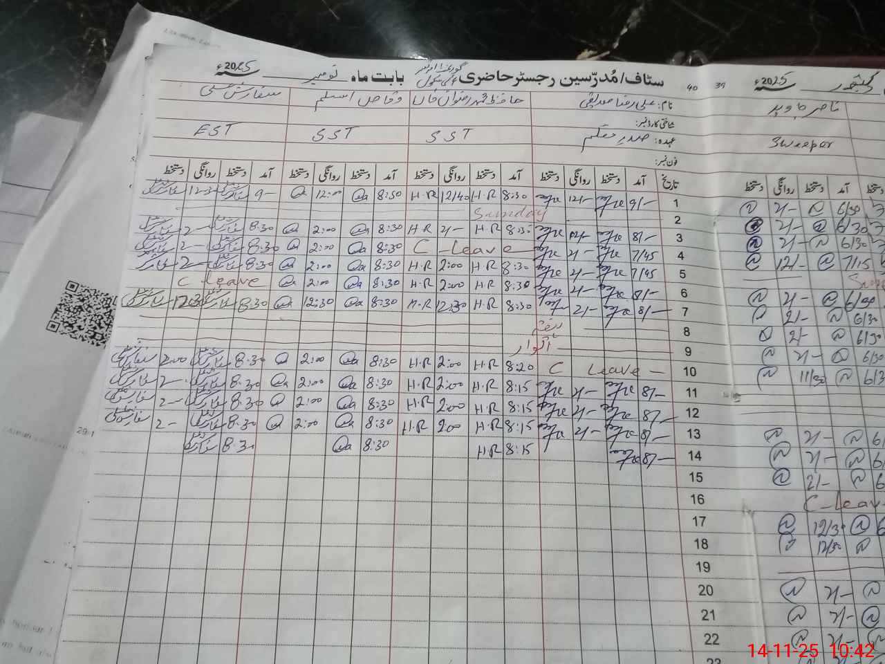 | CNIC | Full Name | Designation | R/C | Absence During Last Calender Month |