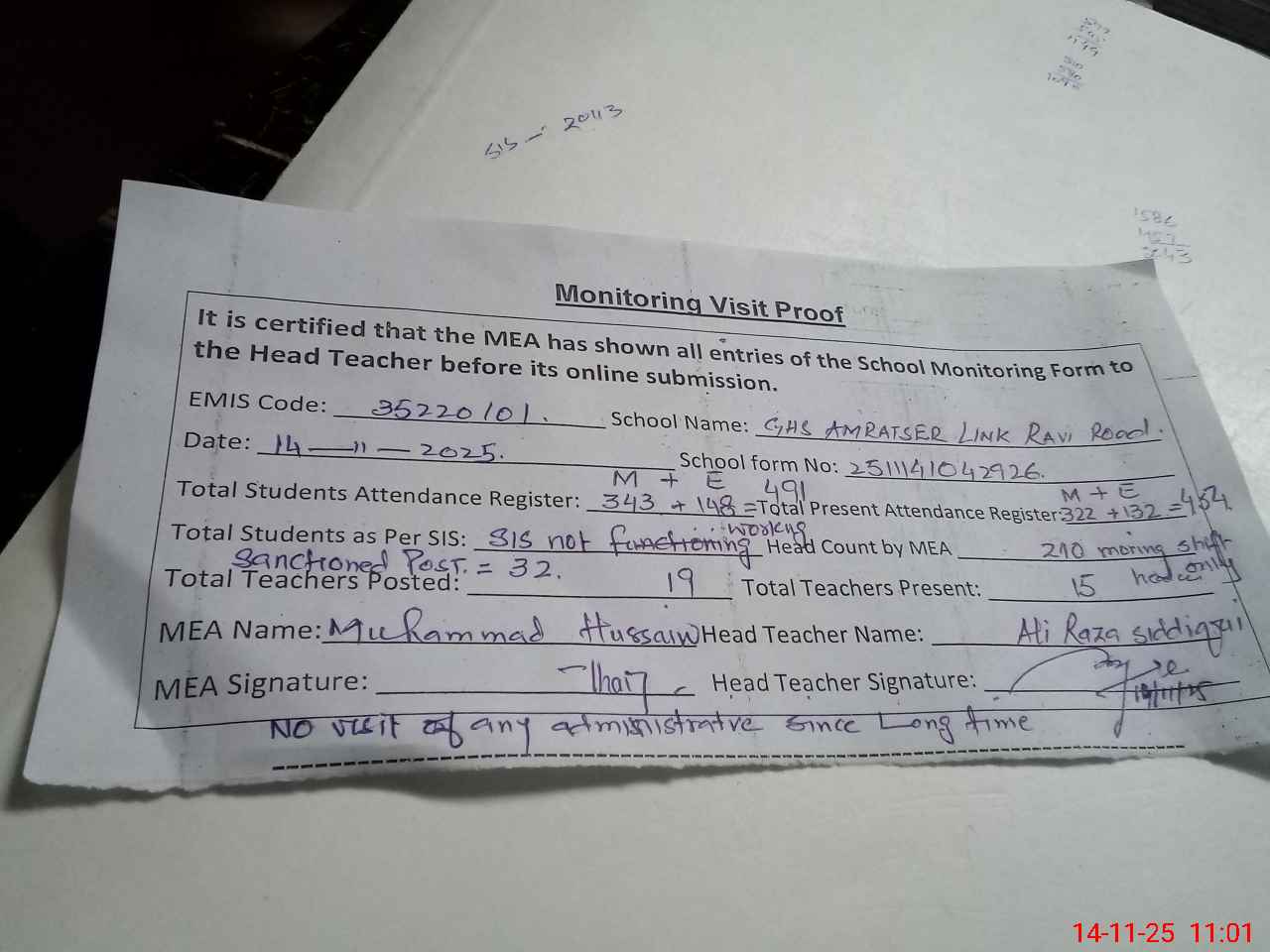 | Remarks (Use Separate Page if Required): 1 No visit of any admistrative since long time 2 One toilet door broken 3 Total students in roznamcha morning shift 384 and as per register morning total students 343 total 41 students difference 4 As per roznamcha morning students present 322 but during head count 210 students presents difference 112 students 5 During visit sis not working | |||||
