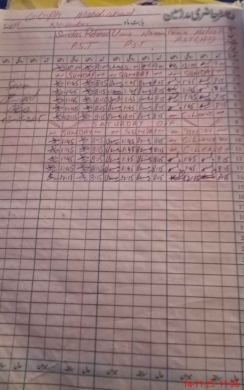 | CNIC | Full Name | Designation | R/C | Absence During Last Calender Month |