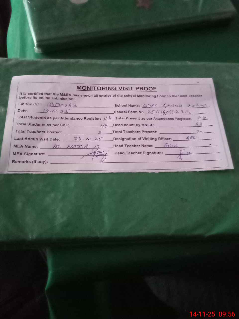 | Attendance Register | Head Teacher | MEA with School | Visit Proof |
