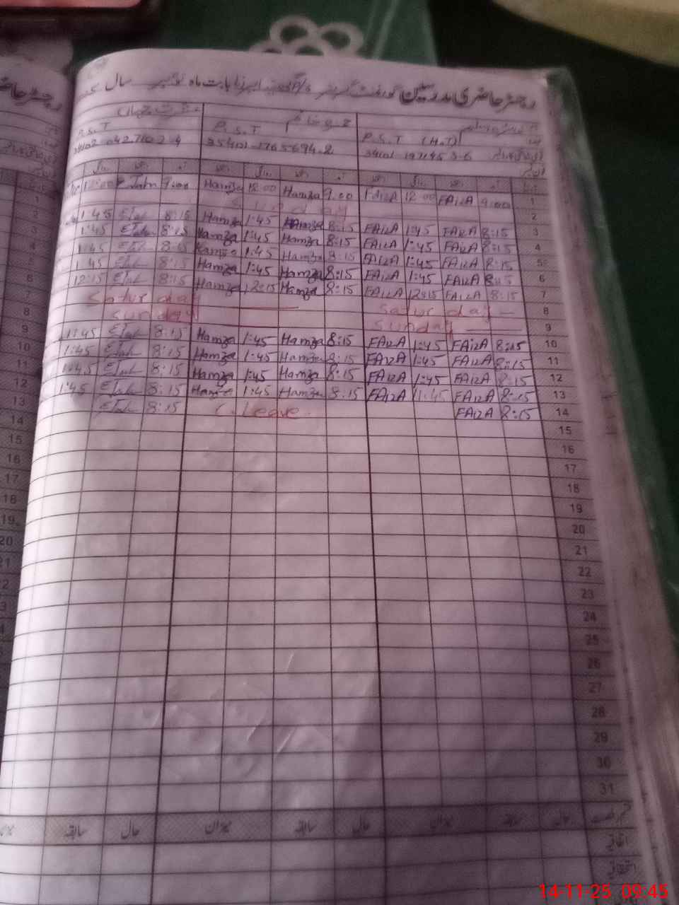 | CNIC | Full Name | Designation | R/C | Absence During Last Calender Month |