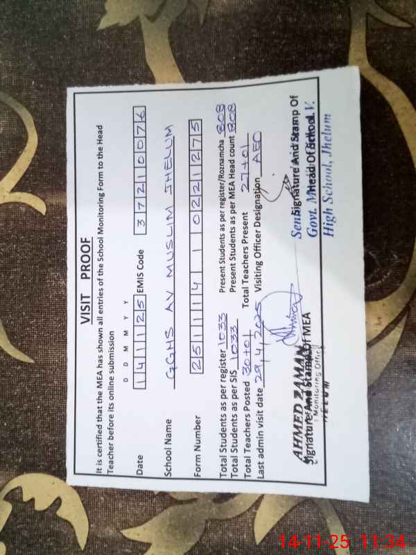 | EMIS Code: 37210076 | Name of School: GGHS AV MUSLIM JHELUM | |||