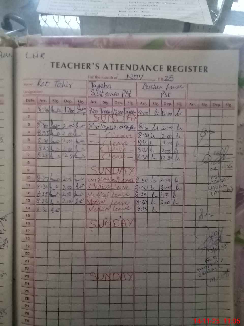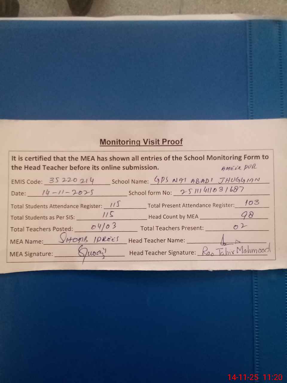 | Remarks (Use Separate Page if Required): 1 One teacher named Zafar Iqbal PST has been removed from service w e f 06 August 2024 but his name still available in SIS 2 AEO Waleed Ashraf conducted last visit on 13 Nov 2025 | |||||