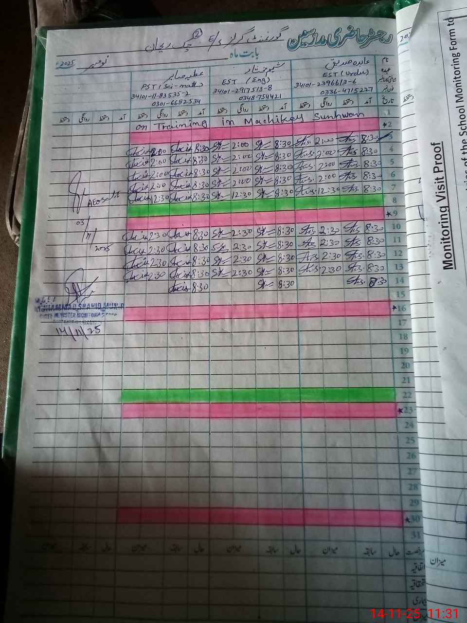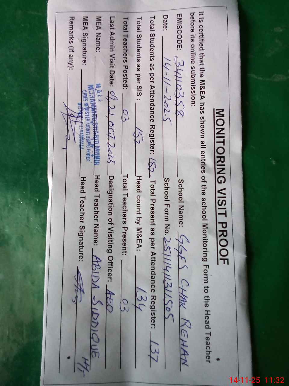 | Attendance Register | Head Teacher | MEA with School | Visit Proof |