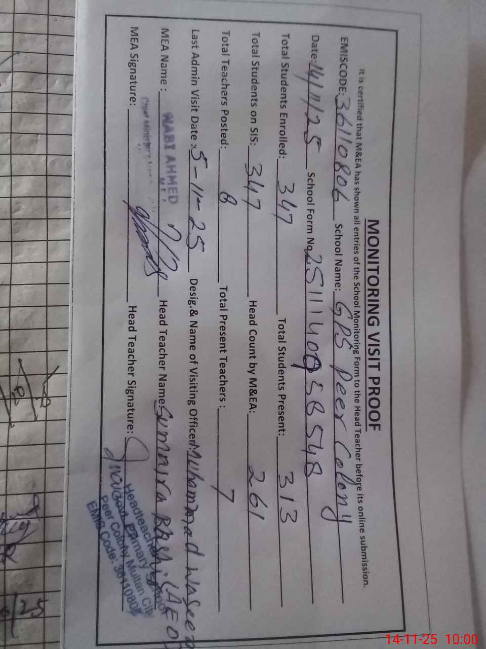 | Attendance Register | Head Teacher | MEA with School | Visit Proof |