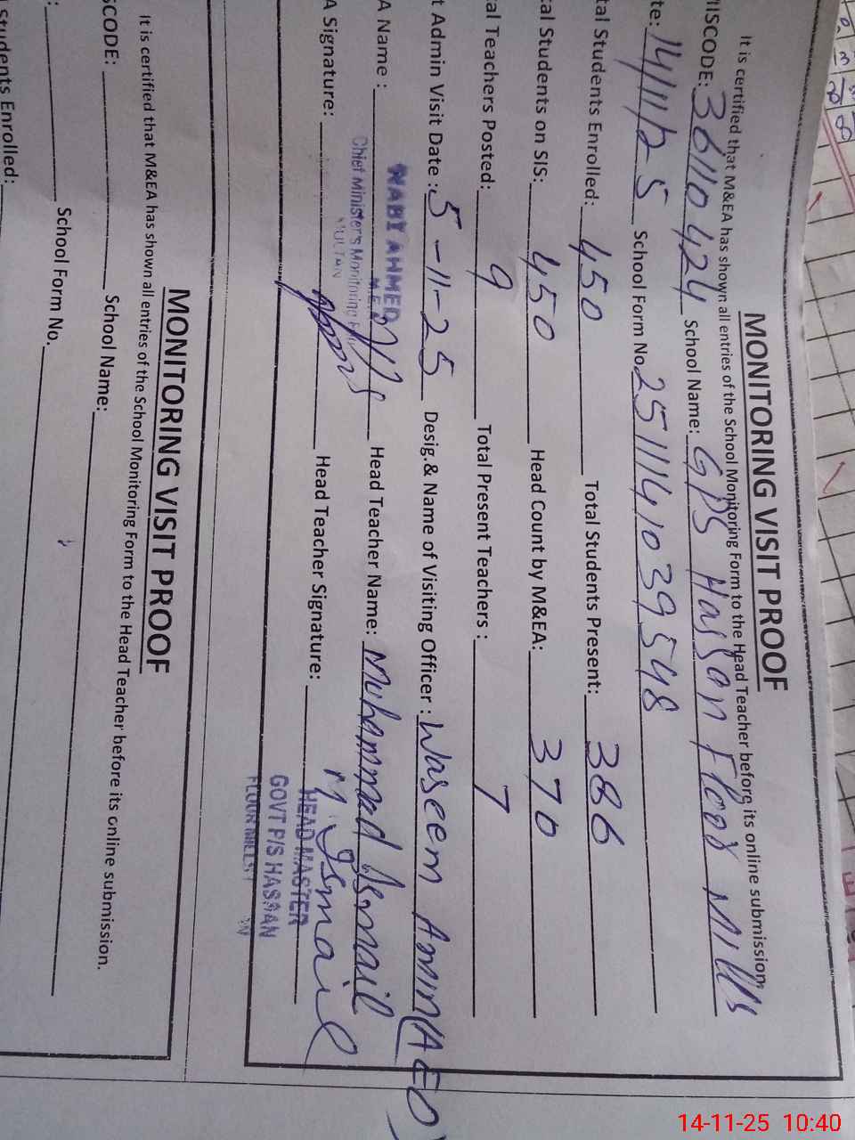 | Certified that this School was Inspected by the Undersigned MEA/DMO Today and the Information Stated Above is as Per Record. | |||||