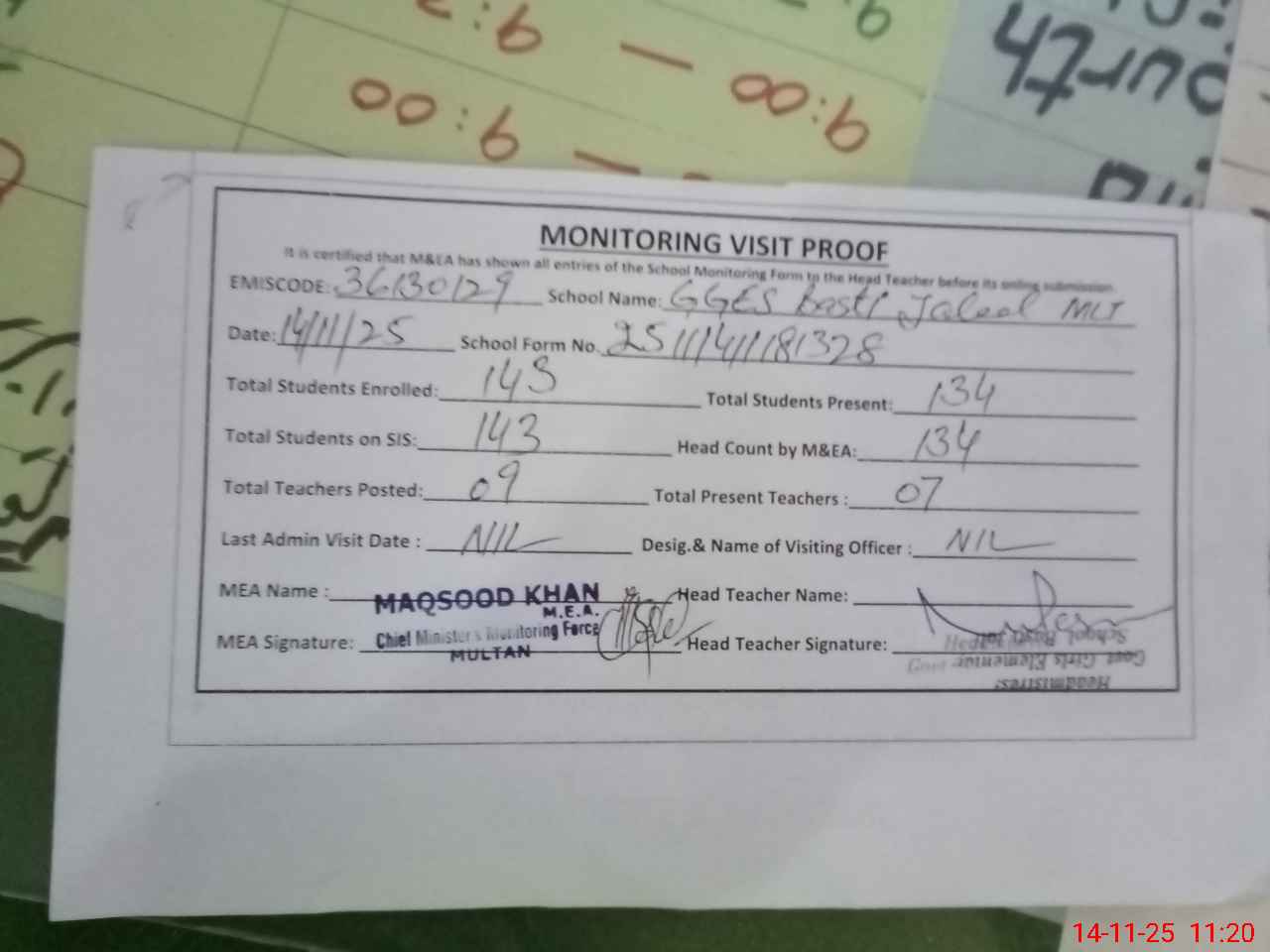 | EMIS Code: 36130129 | Name of School: GGES BASTI JALIL MULTAN P/O BASTI JALIL | |||