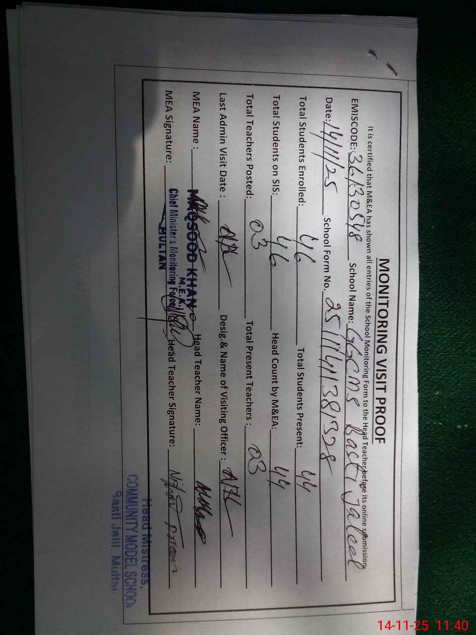 | Certified that this School was Inspected by the Undersigned MEA/DMO Today and the Information Stated Above is as Per Record. | |||||