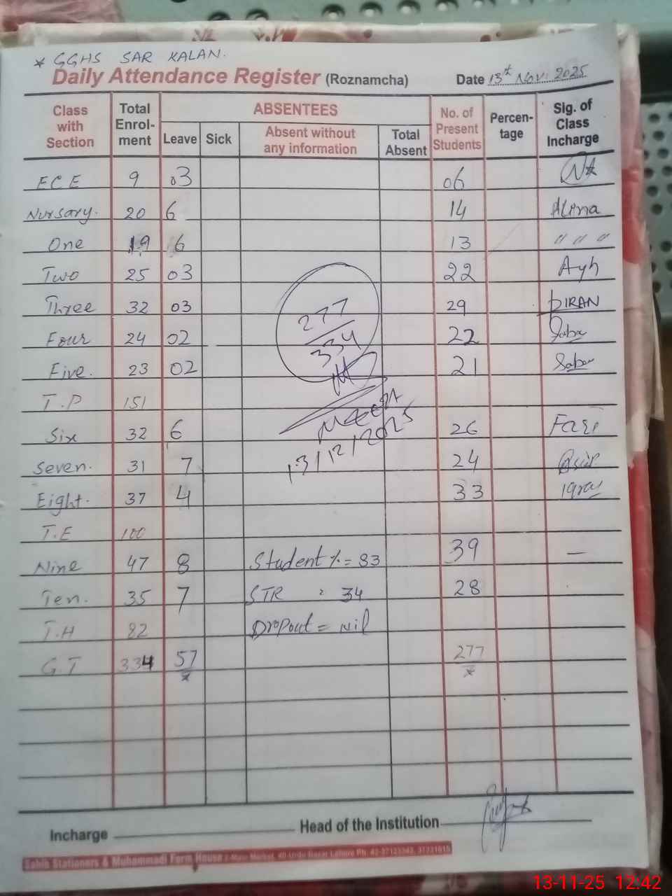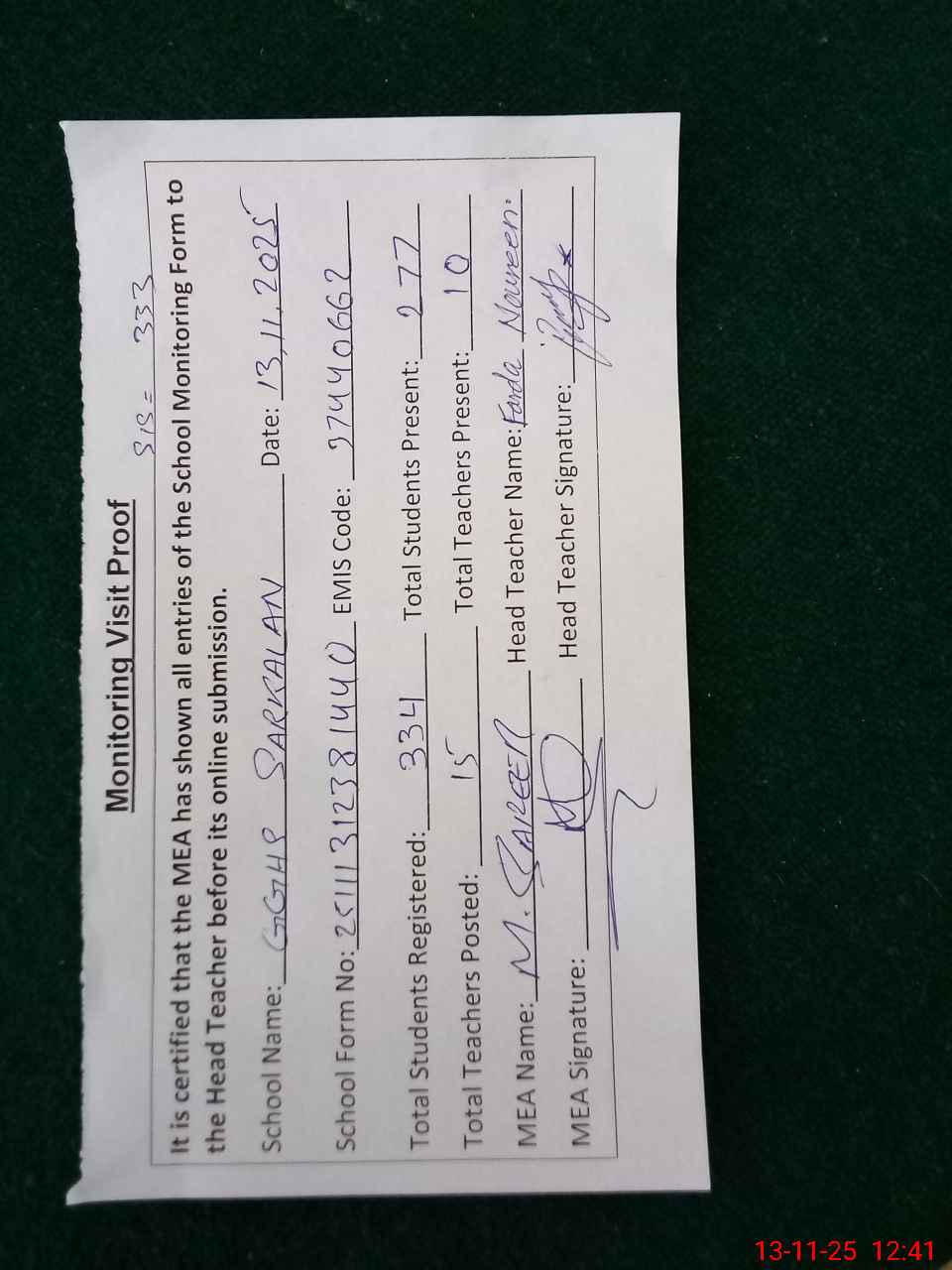 | Attendance Register | Head Teacher | MEA with School | Visit Proof |
