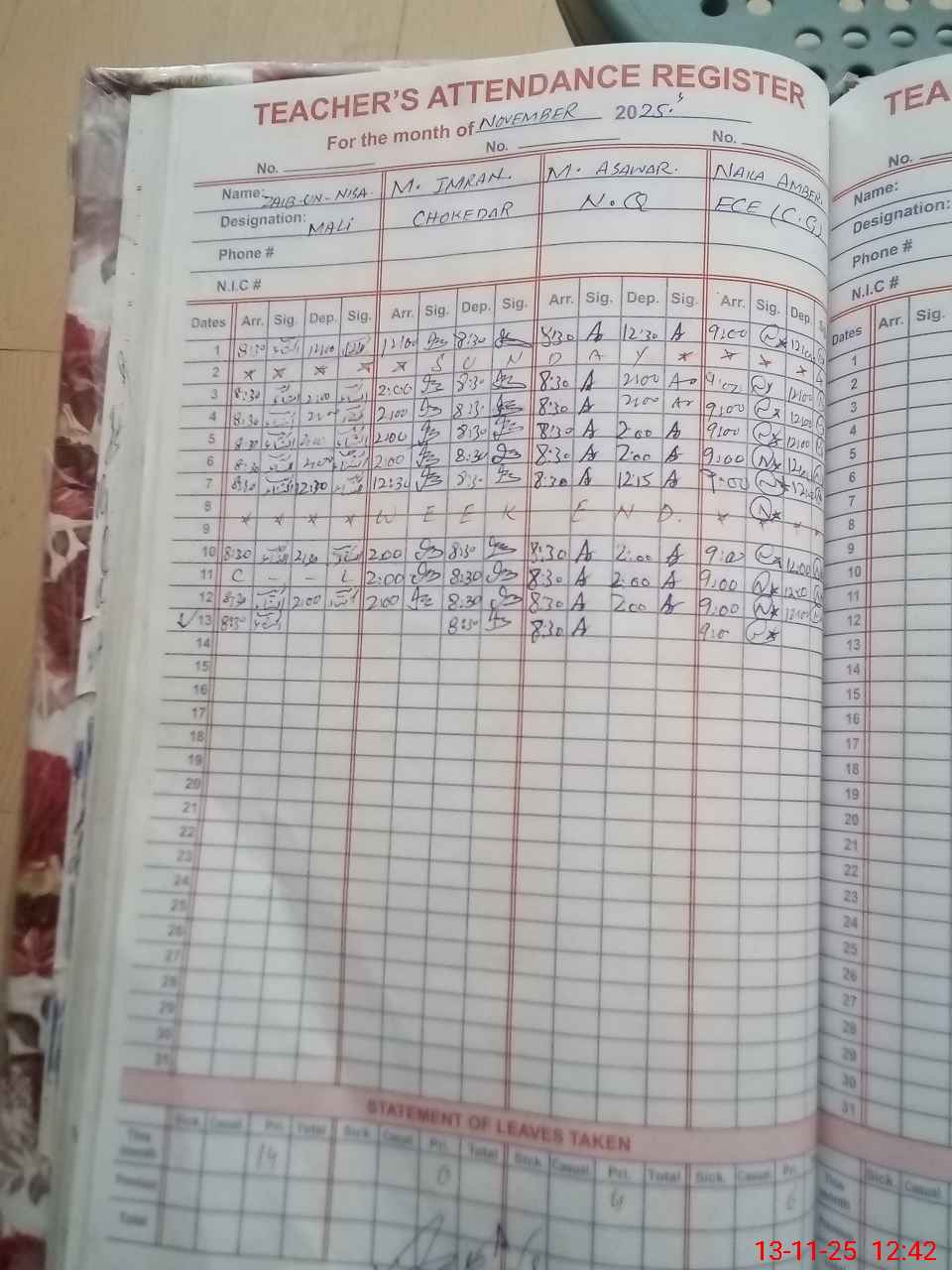 | CNIC | Full Name | Designation | R/C | Absence during last cal. month |