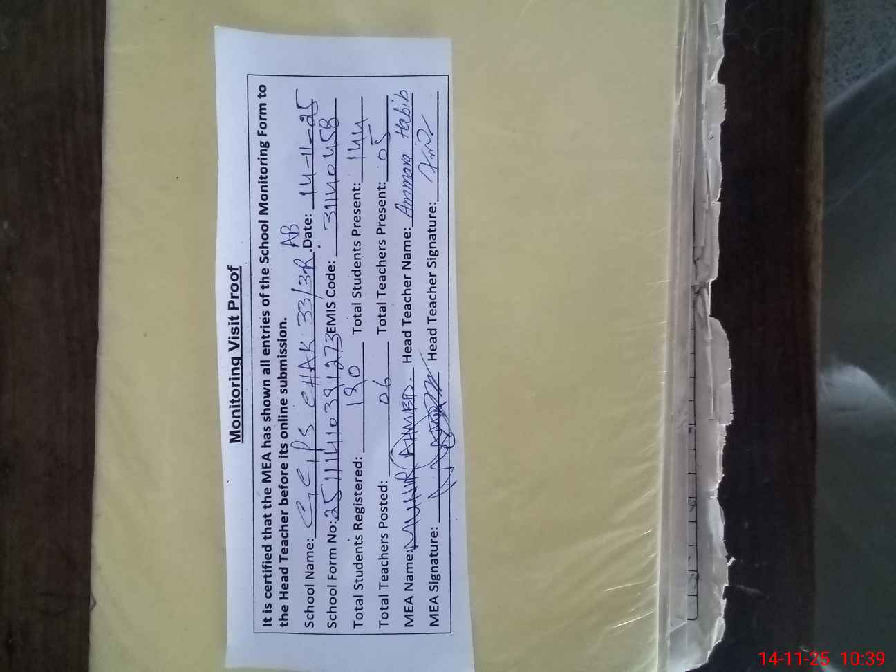 | Attendance Register | Head Teacher | MEA with School | Visit Proof |