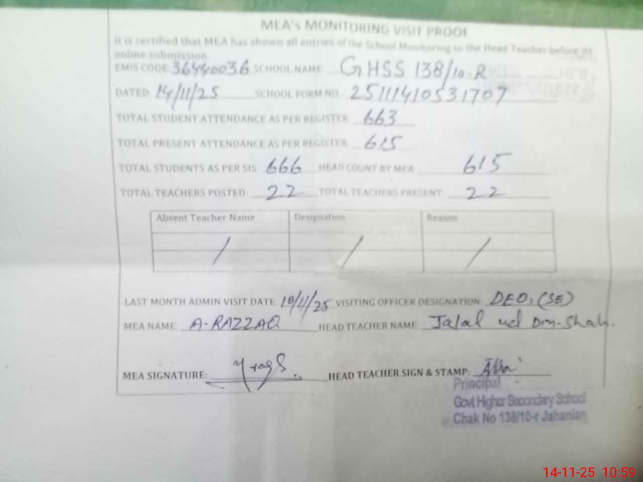 | Attendance Register | Head Teacher | MEA with School | Visit Proof |