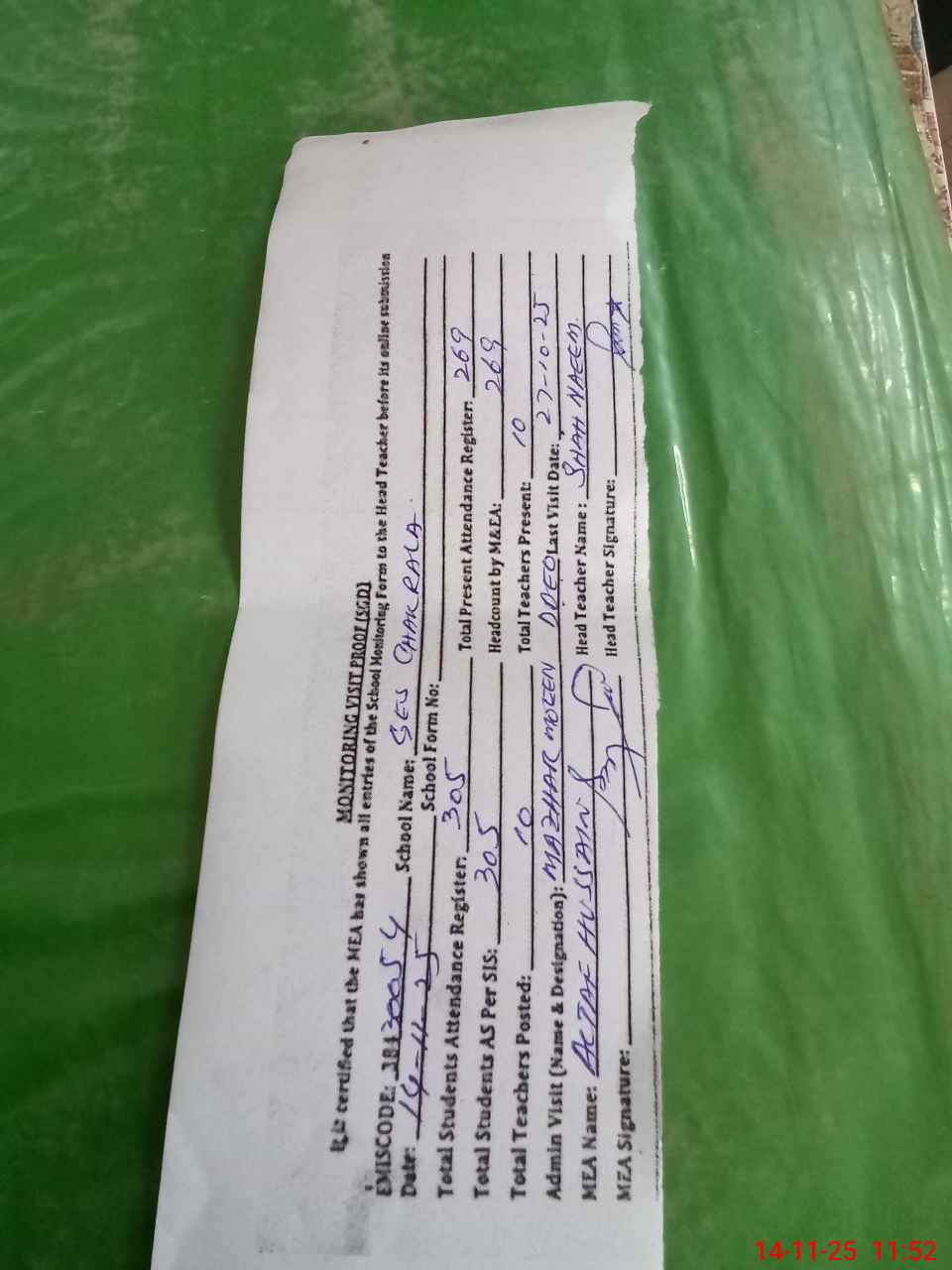 | Attendance Register | Head Teacher | MEA with School | Visit Proof |