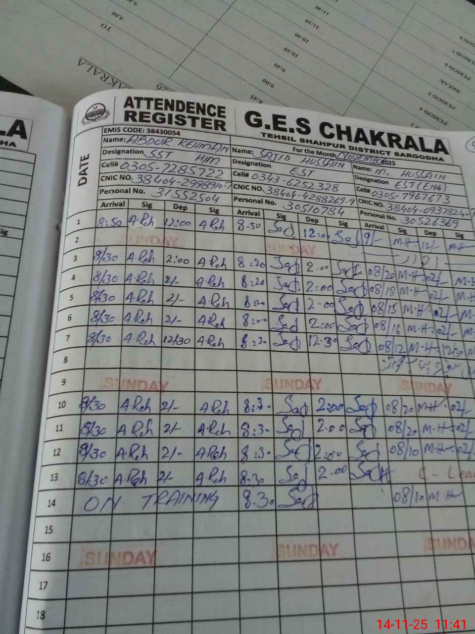 | CNIC | Full Name | Designation | R/C | Absence during last cal. month |