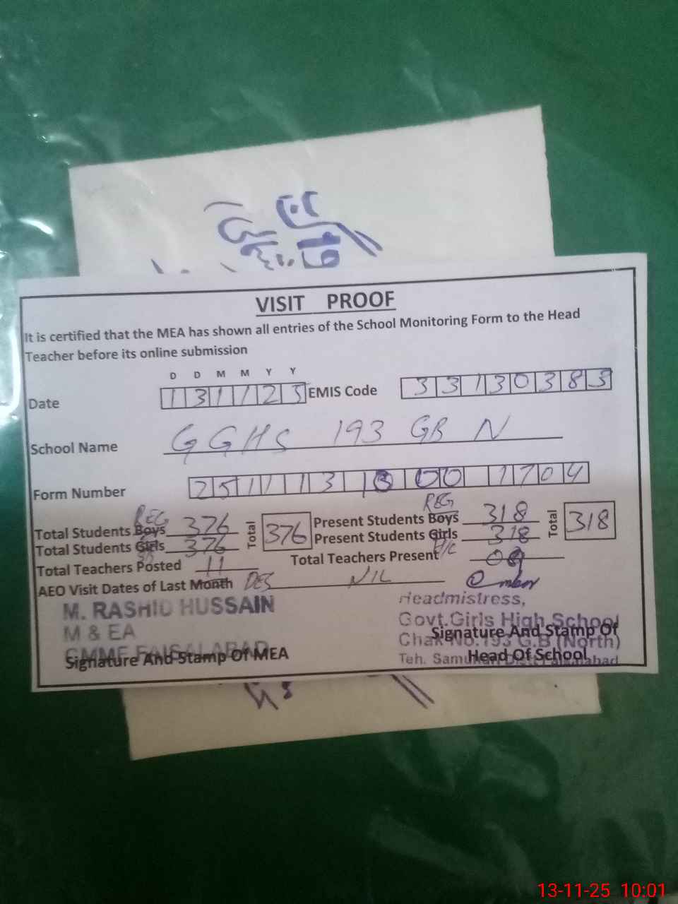| EMIS Code: 33130383 | Name of School: GGHS CHAK NO 193 GB N | |||