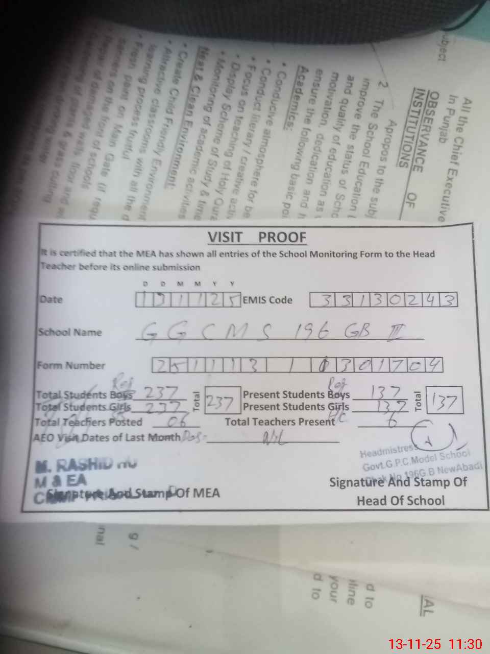 | EMIS Code: 33130243 | Name of School: GGCMS CHAK 196 GB III SANDOORI | |||