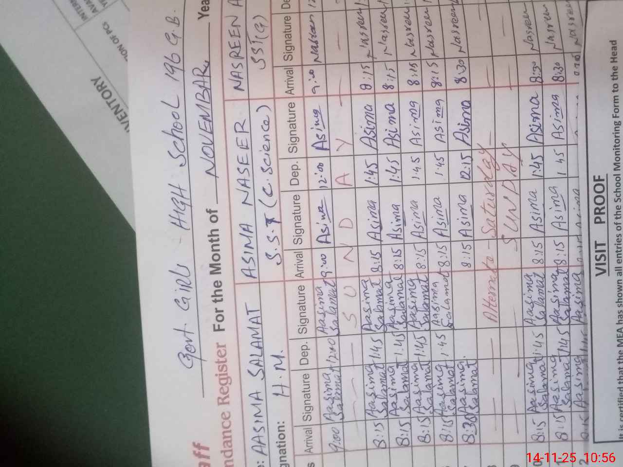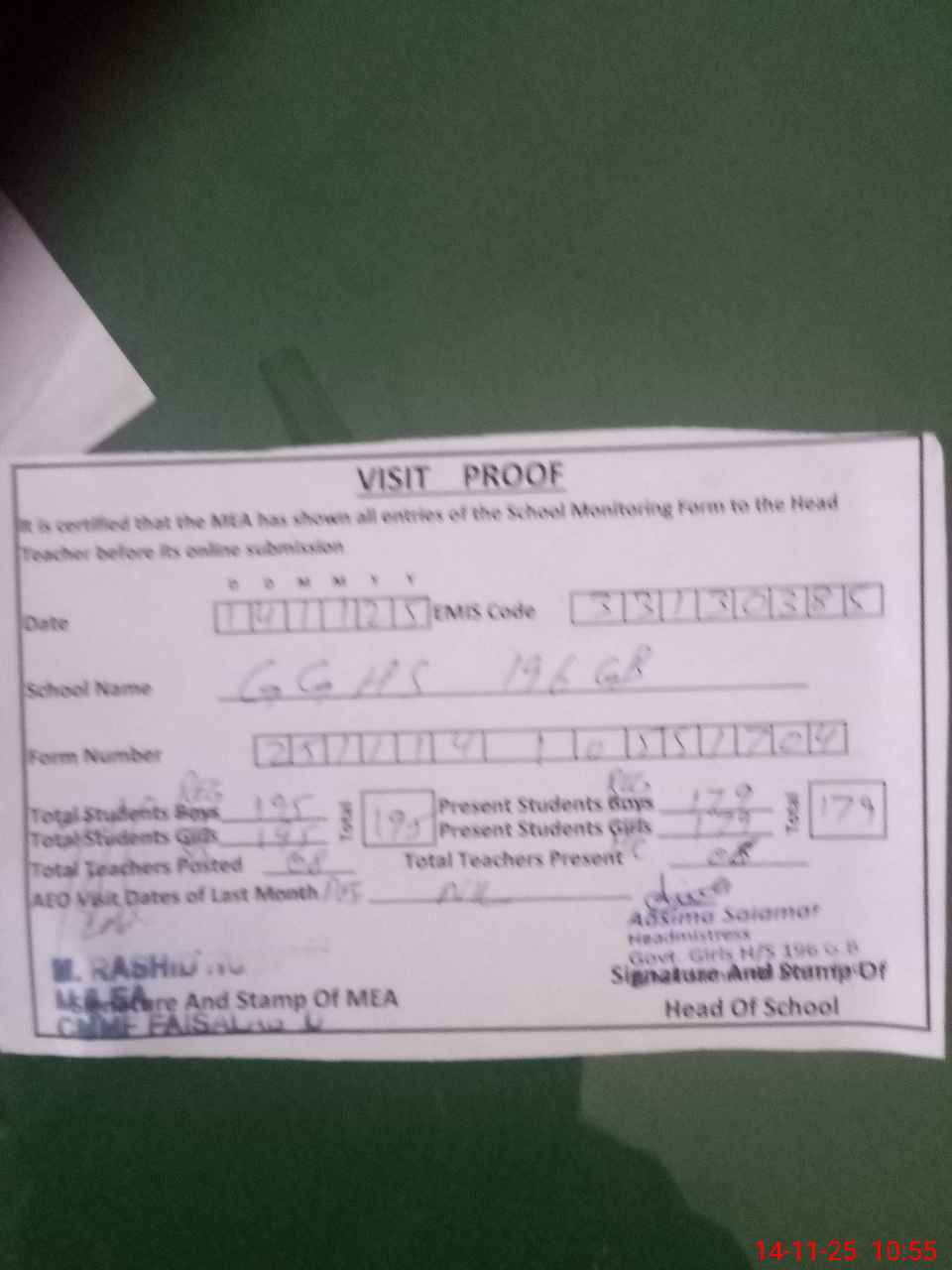 | Attendance Register | Head Teacher | MEA with School | Visit Proof |
