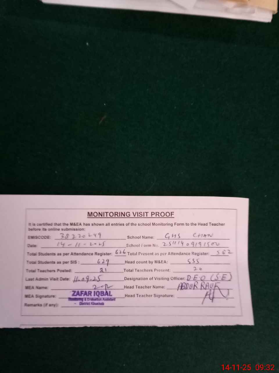 | Attendance Register | Head Teacher | MEA with School | Visit Proof |