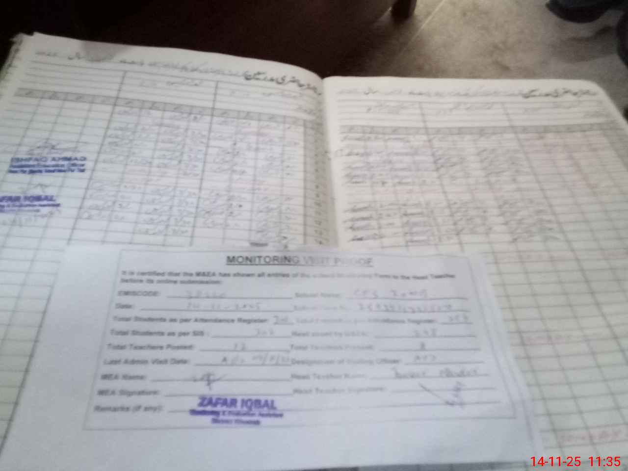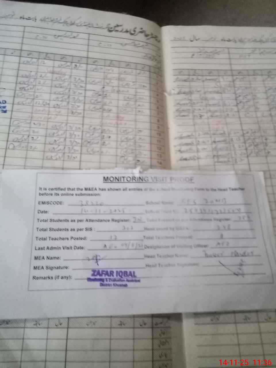 | Attendance Register | Head Teacher | MEA with School | Visit Proof |