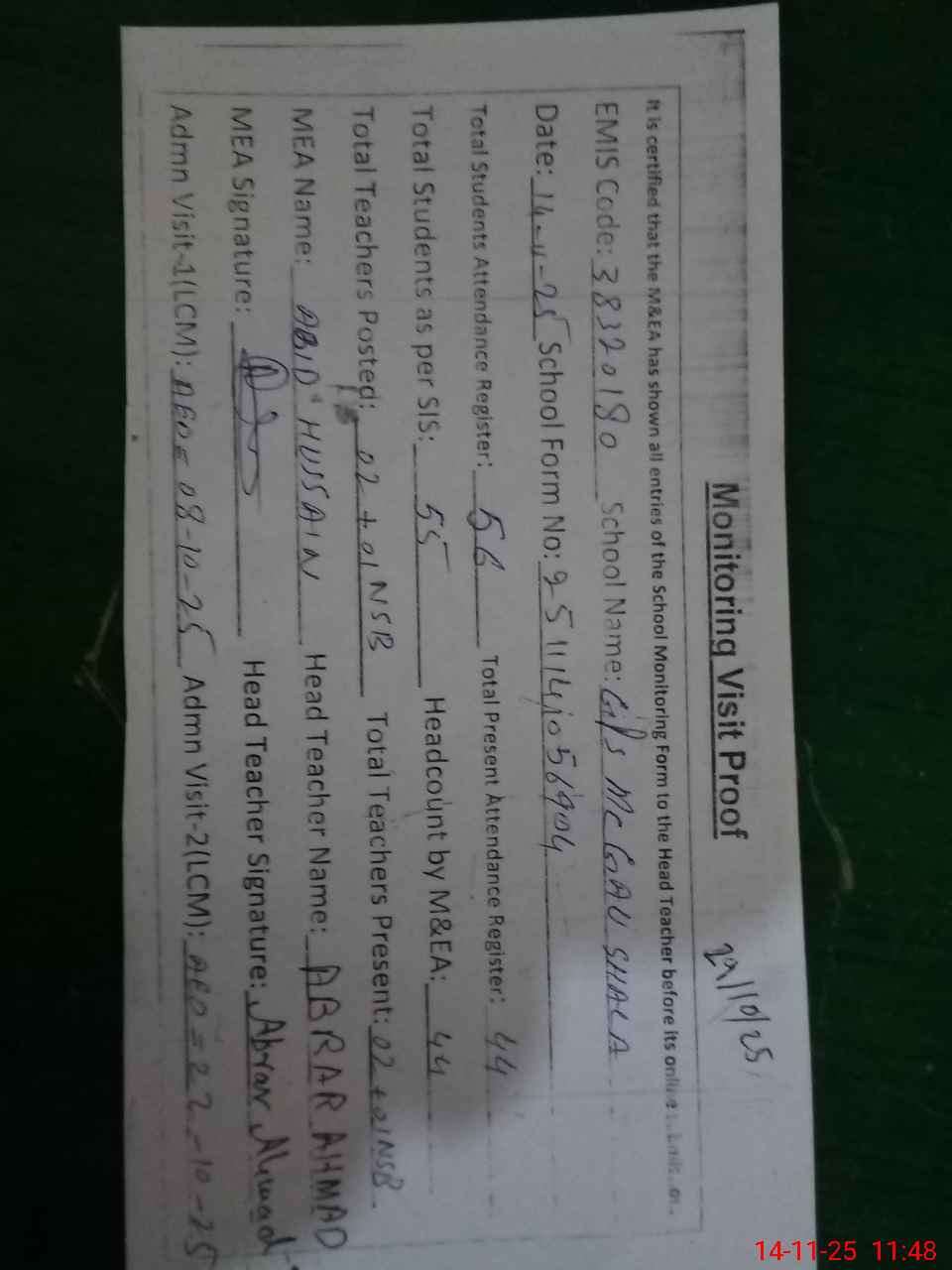| Attendance Register | Head Teacher | MEA with School | Visit Proof |