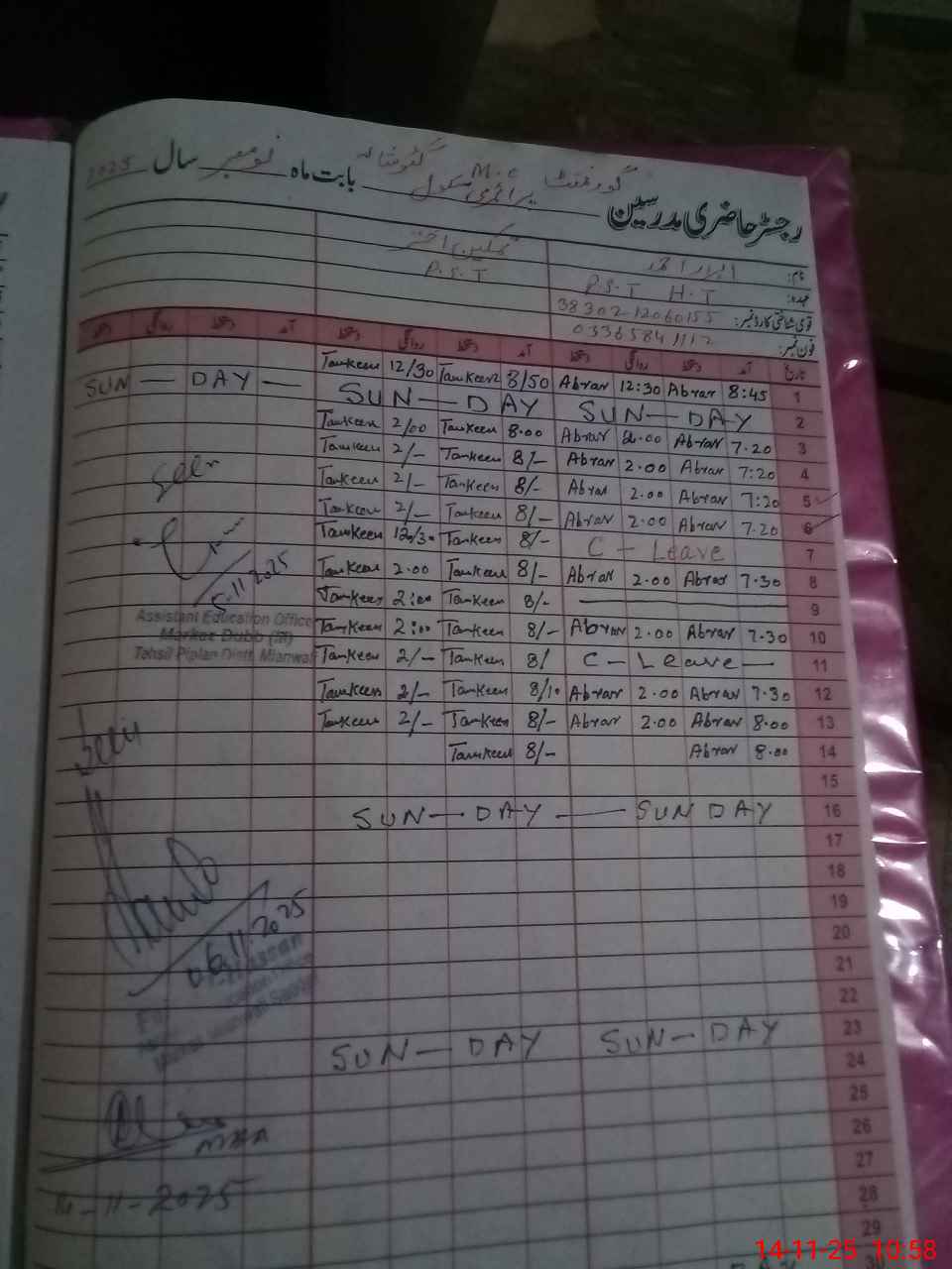 | CNIC | Full Name | Designation | R/C | Absence During Last Calender Month |