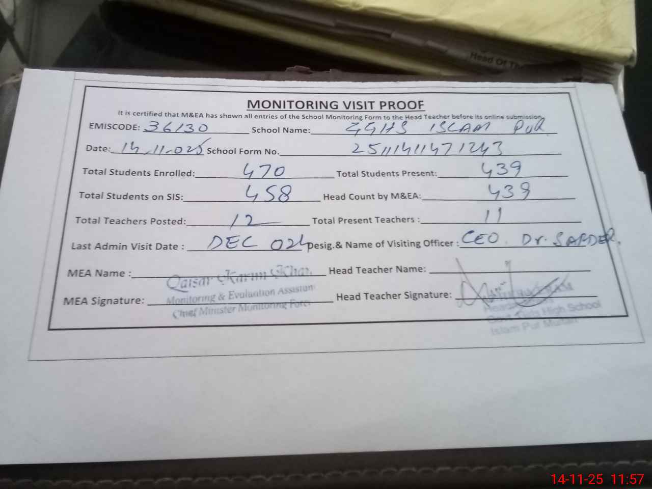 | Attendance Register | Head Teacher | MEA with School | Visit Proof |