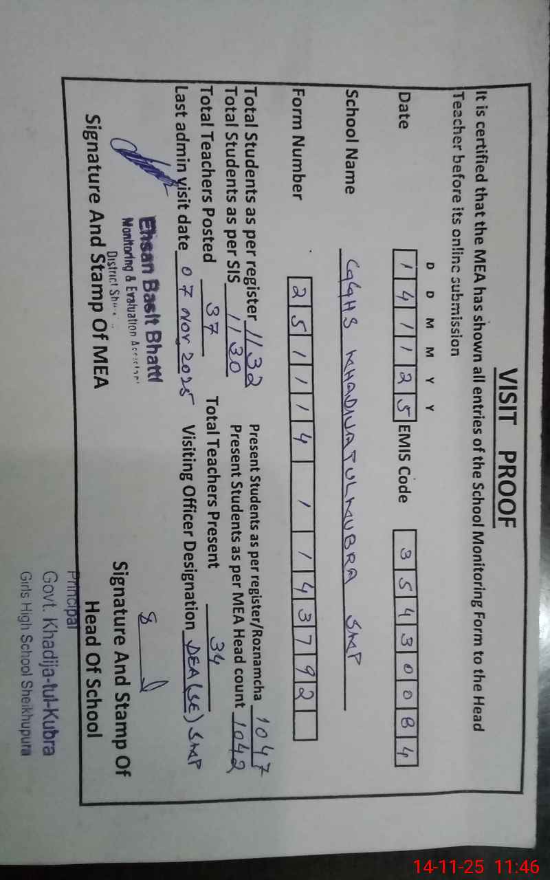 | EMIS Code: 35430084 | Name of School: GGHS KHADIJA-TUL-KUBRA SHEIKHUPURA | |||