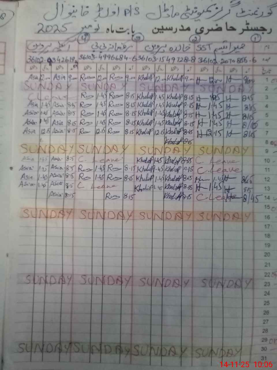 | CNIC | Full Name | Designation | R/C | Absence During Last Calender Month |