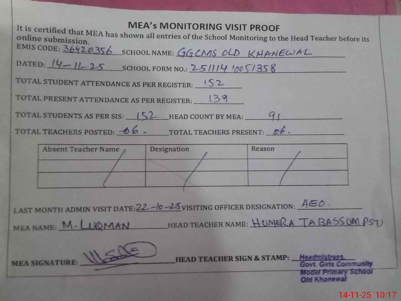 | Attendance Register | Head Teacher | MEA with School | Visit Proof |