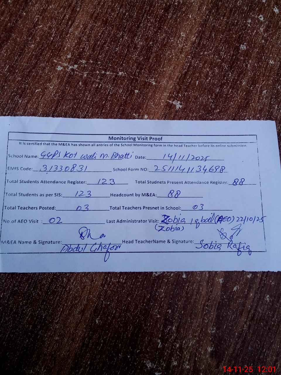 | Attendance Register | Head Teacher | MEA with School | Visit Proof |