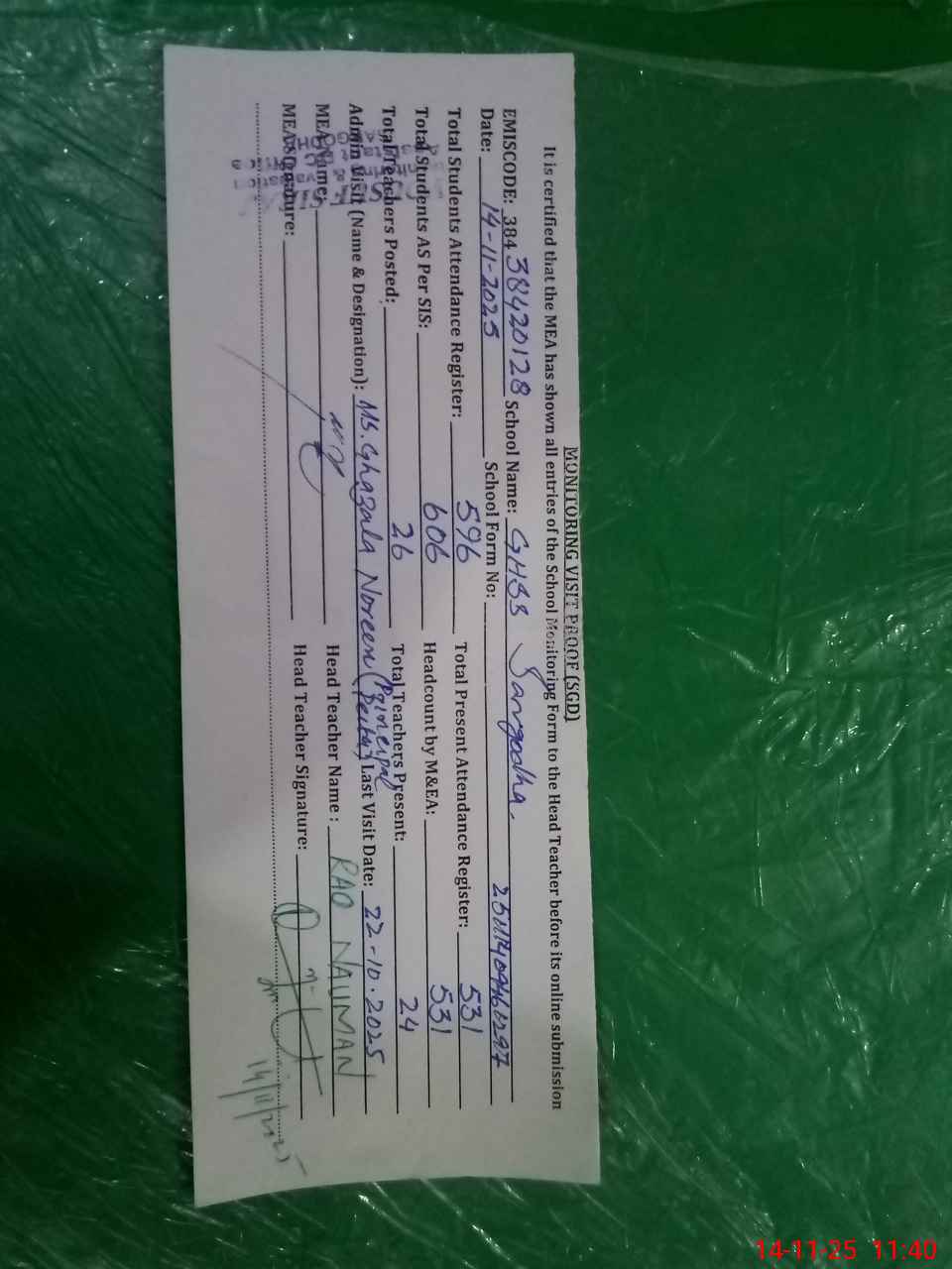 | Attendance Register | Head Teacher | MEA with School | Visit Proof |