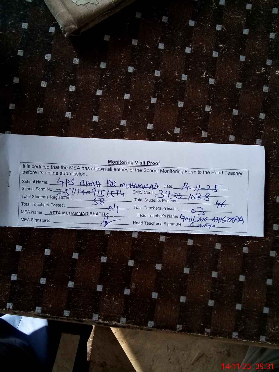| Attendance Register | Head Teacher | MEA with School | Visit Proof |