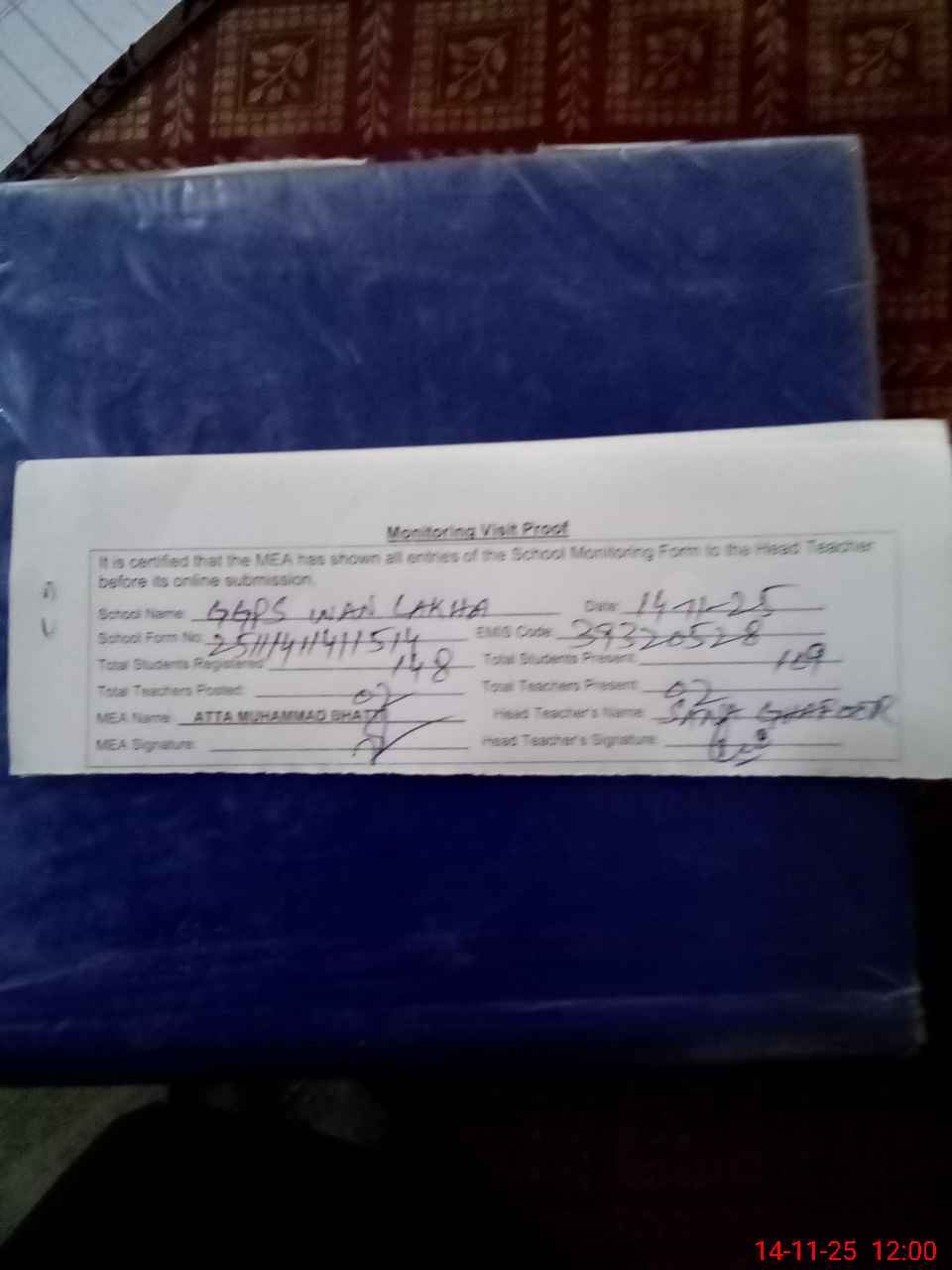 | Remarks (Use Separate Page if Required): Last admin visit by AEO on 20 October 2025 Boundary wall about 130 RFT fell down during last moon soon required to rebuild | |||||