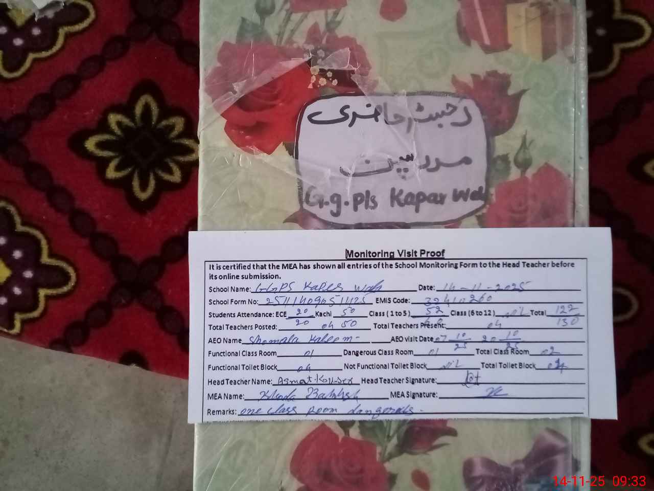 | Attendance Register | Head Teacher | MEA with School | Visit Proof |