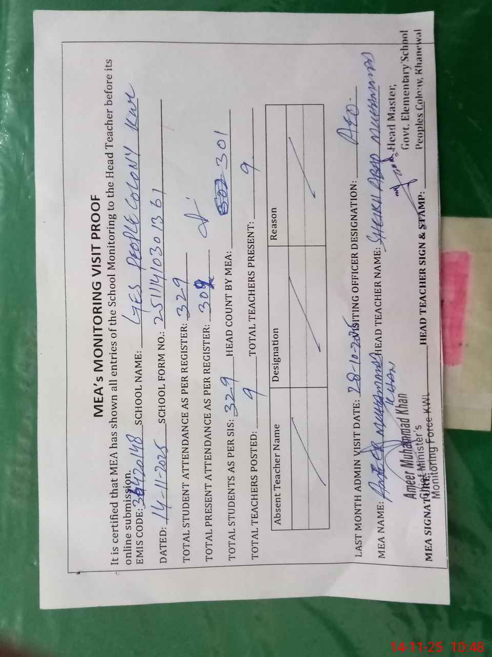 | EMIS Code: 36420148 | Name of School: GES PEOPLES COLONY, KHANEWAL | |||