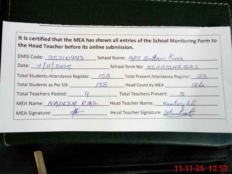| Attendance Register | Head Teacher | MEA with School | Visit Proof |